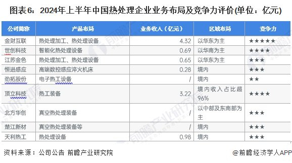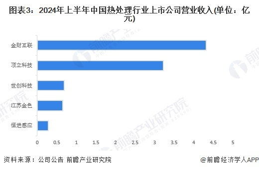 根据各公司公报,按热处理业务收入来看,2024年上半年,金财互联以4.32亿元的业务收入位列第一;顶立科技业务收入为3.22亿元,位列第二;世创科技和江苏金色业务收入分别为0.69亿元、0.65亿元,位列第三和第四。