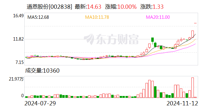 11月11日晚,道恩股份(002838)公告称,拟通过发行股份及支付现金的方式收购山东道恩钛业股份有限公司(简称“道恩钛业”)100%股份并募集配套资金。公司股票自2024年11月12日开市起复牌,开盘当日公司股价一字板涨停。