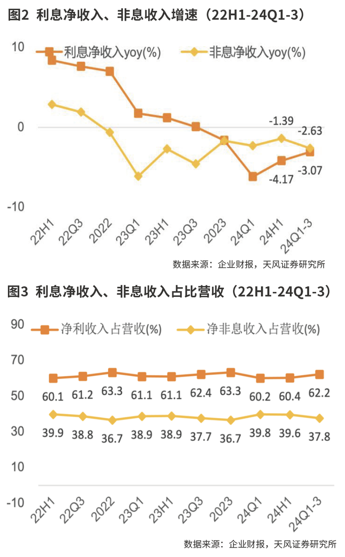 具体拆分来看,净利息收入同比回落3.07%(2024年上半年为-4.2%),净利息收入较上半年有所改善;非息收入同比回落2.6%,降幅较上半年走阔1.2个百分点,主要是受部分产品降费叠加客户投资意愿偏弱的影响,其中,中间业务收入同比降幅收窄1.7个百分点至负增长16.9%,其中,财富管理手续费及佣金收入同比降幅较上半年收窄4.9个百分点至负增长27.6%,边际同步改善。