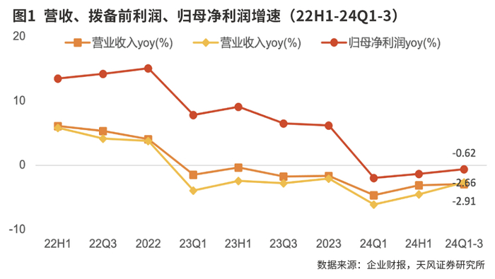 从同比环比变化来看,招商银行2024年前三季度归母净利润同比回落0.62%(2024年上半年为-1.3%),其中,营收同比下滑2.91%(2024年上半年为-3.1%),增速降幅分别较上半年收窄0.7个百分点、0.2个百分点。