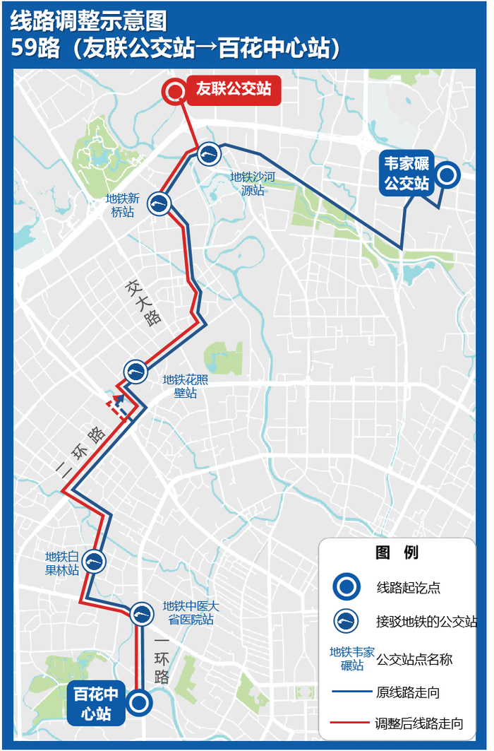 为方便政通路、金丰路周边市民前往地铁27号线新桥站换乘,拟将59路起讫点调整为百花中心站-友联公交站,原中环路洞子口路段公交服务由25路覆盖,满足沿途市民的出行需求。