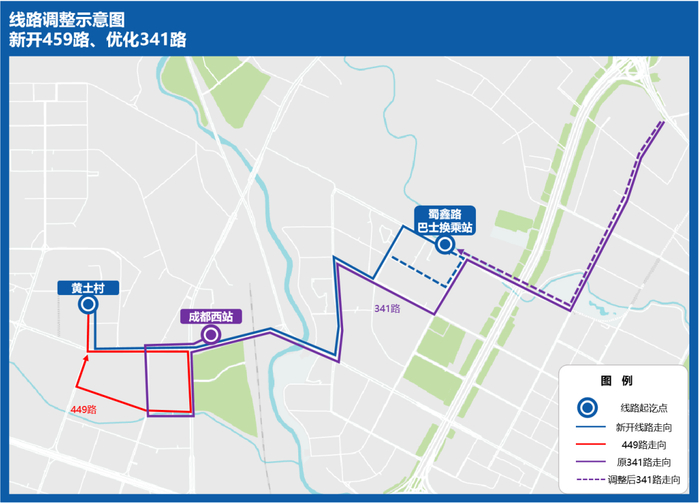 为方便清波社区市民换乘地铁4号线、9号线、27号线,拟新开459路、优化341路,线路起讫点为蜀鑫路巴士换乘站-黄土村,同步将高峰发车频率缩短至6分钟。