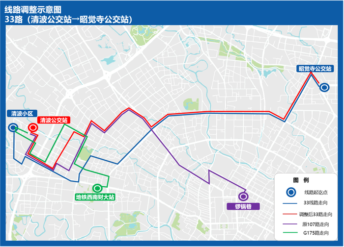 为方便清波社区周边市民前往地铁27号线黄忠站换乘,拟整合33路、107路、G175路,优化后线路代码为33路,线路起讫点调整为清波公交站-昭觉寺公交站,同步将高峰发车频率缩短至6分钟。原花牌坊街公交服务将由62路、37路等线路覆盖,原二环路公交服务将由32路覆盖,满足沿途市民出行需求。