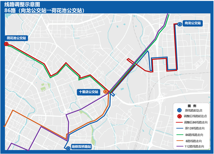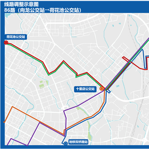 为进一步提升龙潭工业园公交服务质效,增强地铁8号线公交纵向覆盖,拟整合86路、128路、112路,优化后线路代码为86路,线路起讫点调整为向龙公交站-荷花池公交站,原成华大道、崔家店路公交服务将由20路、K16线覆盖,同步将高峰发车频率缩短至5-7分钟。