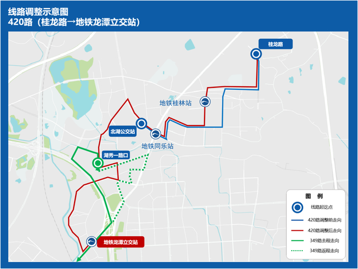 为方便民兴人家以及北湖国际片区市民前往38中、石室北湖学校等学校,拟整合213路、349路,强化地铁8号线龙潭立交站和桂林站的公交接驳,优化后线路代码为420路,线路起讫点调整为桂龙路-地铁龙潭立交站,原东三环路一段、湖秀二路公交服务将由1133路覆盖,同步将高峰发车频率缩短至5-7分钟。