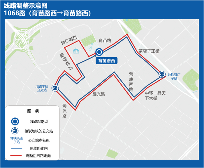 为方便育仁南路、育德路周边市民前往地铁2号线、27号线羊犀立交站和7号线茶店子站换乘,同步覆盖蜀明西路、育仁南路公交薄弱区域,拟调整1068路线路走向,满足沿途市民的出行需求。