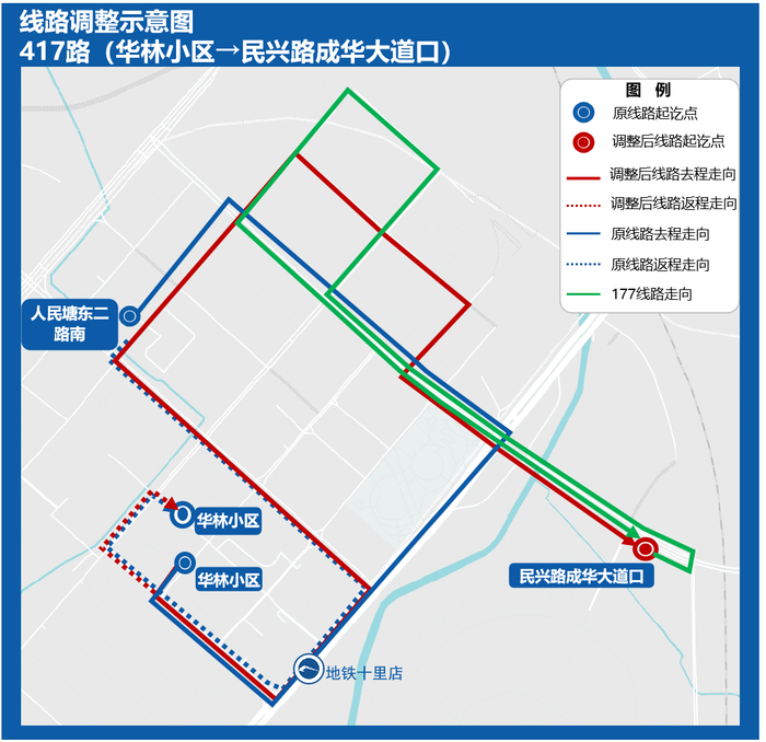 为强化十里店片区地铁8号线十里店站公交接驳,方便市民通勤、就医等生活出行,拟整合177路、199路,优化后线路代码为417路,线路起讫点调整为华林小区-民兴路成华大道口,原民兴路公交服务将由14路、67路覆盖,同步将高峰发车频率缩短至5-7分钟。
