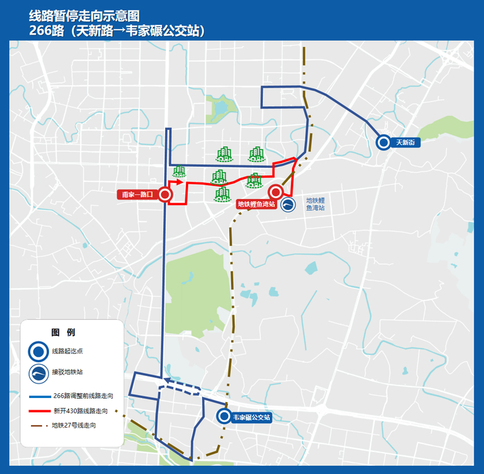 为方便鲤鱼湾片区市民通勤、通学,拟优化266路,强化地铁27号线鲤鱼湾站、快速公交K15线间的公交接驳,优化后线路代码为430路,原北星大道、大天路公交服务将由465、651路覆盖,满足沿途市民的出行需求。