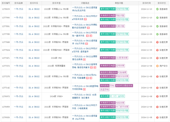 电车通援引车质网显示,有投诉车主介绍,从21年起购买一汽大众ID系车列车型,当时宣传中明确提到车辆具备OTA升级功能,但三年多的等待让广大车主深感被欺骗、愚弄。并且由于一汽大众没有对ID.4车型进行任何OTA升级,该系列汽车二手车价不断跌出新低。