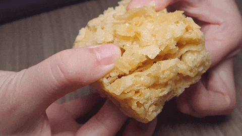 沙琪玛看似简单,做起来却一步也不能将就——高筋面粉只加鸡蛋调面,而后搓皮、开皮,擀成厚片、切作小段,一个字“炸”,最后上糖,成型出锅。