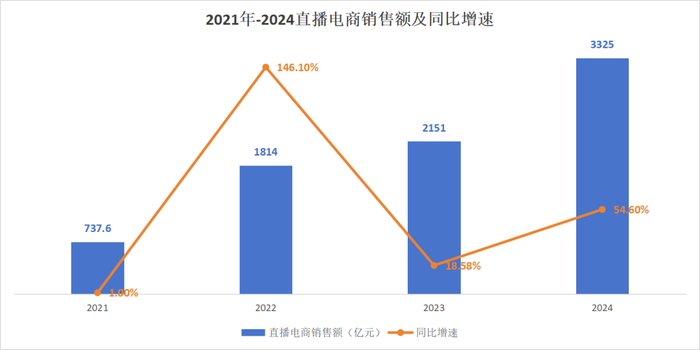 2024年直播电商销售额位3325亿元,同比增长54.6%。直播电商整体格局和去年相同,排序依然是抖音、快手、淘宝直播。