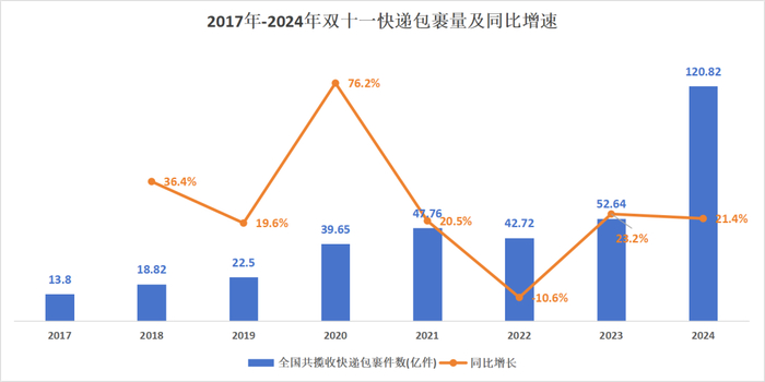 国家邮政局数据显示,10月21日至11月10日,全国快递揽收量约120.82亿件,同比增长21.4%;累计投递量约121.24亿件,同比增长约25.3%;日均业务量超5.5亿件,其中最高日处理量达到7.29亿件,同比增长74%,刷新单日业务量纪录。