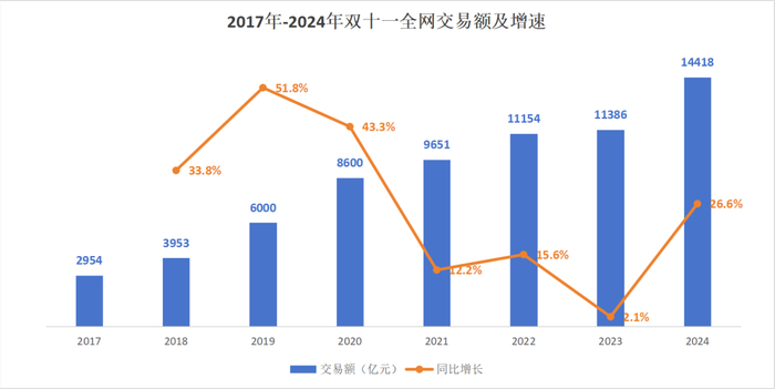 2024年双十一全网总交易额为14418亿元,同比增长26.6%;因为统计时长不同,所以交易额同比数据明显被高估了。粗略计算,2024年双十一的大促时长普遍增加了52.6%(不考虑月初就开始的抖音)。