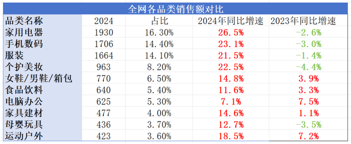 全网十大销售品类都扭转了去年下滑的局面,全面正增长。