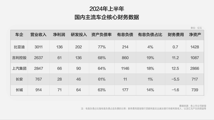 2023年,比亚迪向金融机构的借款只有303亿元,在总负债占比仅为5%;2024年上半年,比亚迪有息负债下降至214亿元,在总负债的占比为4%。对比来看,吉利控股集团的有息负债为860亿元,长城汽车为177亿元,有息负债在总负债的占比分别达到19%和14%。