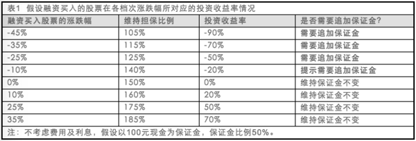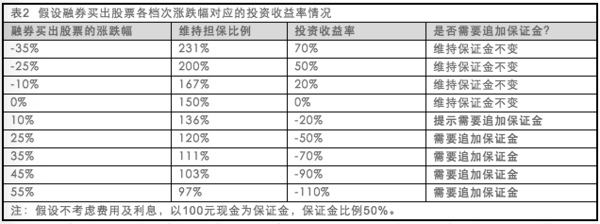 从上表中不难看到,投资者在融资买入股票后有两点必须关注,一是投资收益率的变化;二是维持担保比例的变化。保证金比例越低,收益或亏损的放大倍数就越大,它们基本上呈反比例关系。而当融资买入股票跌到一定程度时,投资者还需要追加保证金。如在股票下跌了35%后,维持担保比例降至115%时,投资者还需要追加保证金。