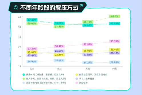 报告深入分析了年轻群体的解压偏好,发现他们在应对压力时更倾向于使用多样化的方式。社交和娱乐是其中的两大主要途径。