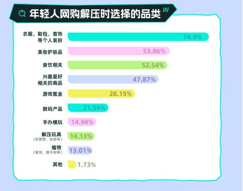 而且,在年轻人眼里,购物不仅是一种娱乐,也是一种缓解心理压力的方式。报告显示,34.7%的年轻人会通过购物来缓解压力。其中,00后更加偏爱具有情感价值的物品,如解压玩具、抱枕等。而年龄稍长的受访者则更倾向于购买实用性强的商品,如按摩仪、精油等。