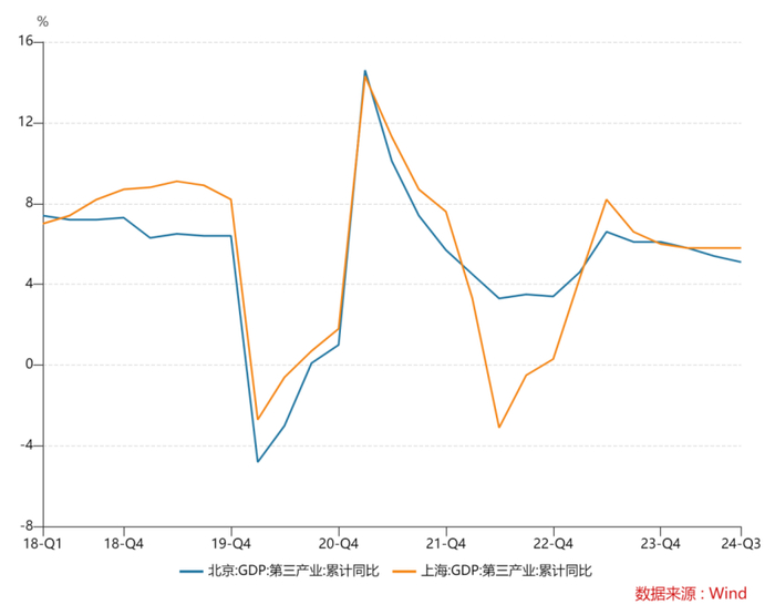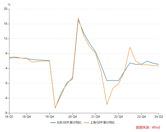 2024年前三季度,北京GDP增速为5.1%,上海则为4.7%,相比过去的高增长,已经明显慢下来了。