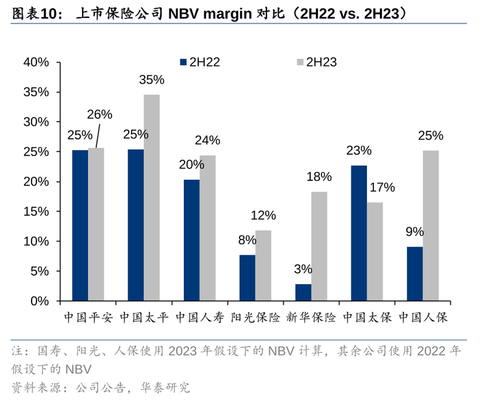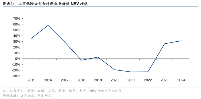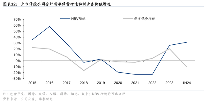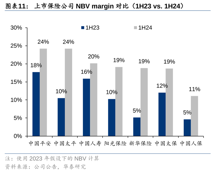产品利润率的大幅提高,进一步推动了NBV的增长。2023年7家上市保险公司合计NBV增速约为26%(可比口径,下同),增长受新单保费提升和利润率提升的双重驱动。1H24虽然新单出现负增长,但NBV利润率的大幅提升支撑了NBV实现更强劲的增长,1H24合计NBV增速达到31%的出色水平。
