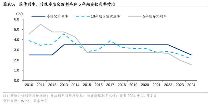 储蓄型寿险兼具长期性和安全性。寿险和储蓄是居民可选择的唯二的相对安全型金融产品,一定程度上都具有保证收益的属性。但保险产品的期限要远长于居民储蓄。长期储蓄寿险产品主要集中在10+年期限,而长期储蓄存款多以1-5年为主。同时,储蓄险的收益要高于存款。从历史上看,2015年以来,传统险定价利率比5年期存款利率高75-100bps。截至2024年10月末,寿险传统险定价利率为2.5%,比5年期存款利率(1.55%)高95bps,高收益、长期限特征明显。可以说,储蓄类寿险产品是兼具长期和安全特征的零售金融产品。