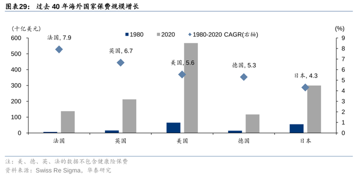 80年代初至20年代末,海外发达经济体经历了长达四十年的利率下行期,对保险业的发展产生了深远影响。我们注意到利率下行并未对寿险业发展形成严重制约,这期间几个主要经济体的寿险业均取得了长足发展。以美国为例,寿险业保费四十年中增长至9倍(1980-2020),年化增长率达到6%;日本在这期间寿险业保费增长至5倍(1980-2020),年化增长率达到4%。对中国的启示就是,利率下行对保险业的增长可能更多是动力而非阻力。