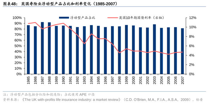 英国浮动产品占比维持80%~90%高位。英国寿险业浮动型产品包括分红险和投连险,其APE合计占比在1985-2007年保持较高位置(超80%),表明在英国这个成熟寿险市场中,利率下行期以浮动型产品为主。具体来看,1985-2000年,分红险占比基本维持在30%~40%左右,投连险占比略高(40%~50%)。而后2000-2007年股市大幅上涨,带动投连险占比提升,压缩分红险份额,但总体来看,浮动型产品占比维持在80%~90%的较高水平。