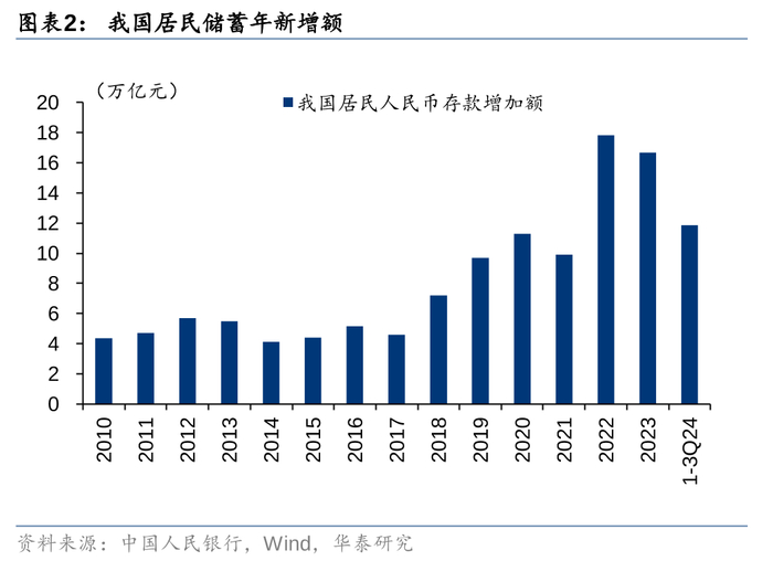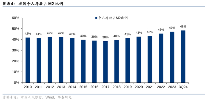 家庭部门投资风险偏好下降,面临“资产荒”。利率下行周期,消费者对于金融产品的安全性重视度上升,安全保本(刚兑)的重要性大过不确定的高收益预期。2022和2023年居民储蓄意识明显提升,我国居民人民币存款增加额分别达17.8和16.7万亿元,而2010-2021年的最高值仅为11.3万亿元。与此同时,居民的投资风险偏好明显下降,2022和2023年公募基金管理规模的增长陷入停滞。2022和2023年我国个人存款占M2比例分别为45.5%和47.2%,而2010-2021年比例基本未超过43%,出现“超额储蓄”现象。2024年前三季度,居民储蓄新增11.9万亿。虽然公募基金新增规模今年有所改善,但居民仍然缺乏有效的资产配置渠道,个人存款占M2的比例上行至48.4%的高位。