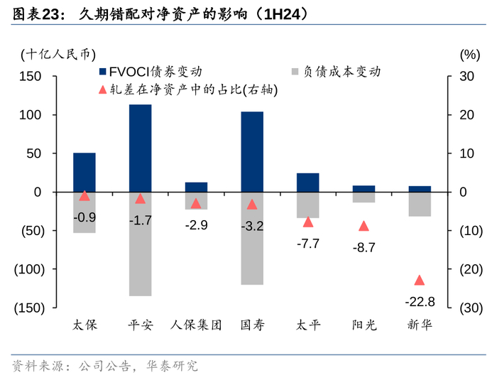 借鉴日本寿险业的计算方式,比较净投资收益率和寿险产品平均定价利率,来衡量是否存在利差损。可以看出目前大公司并无利差损,但利差空间正在收窄。目前上市公司平均的定价利率接近3.0%,以1H24平均3.3%的净投资收益率计算,利差空间只有30bps,相较2015年的200+bps,有了大幅收窄。如果市场利率持续走低,将对利差空间造成持续压力。