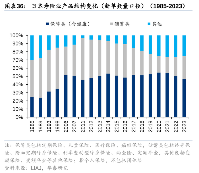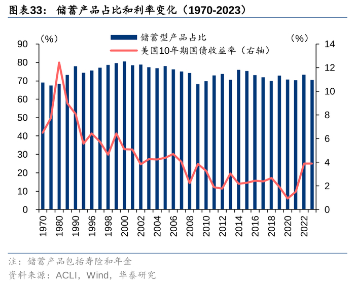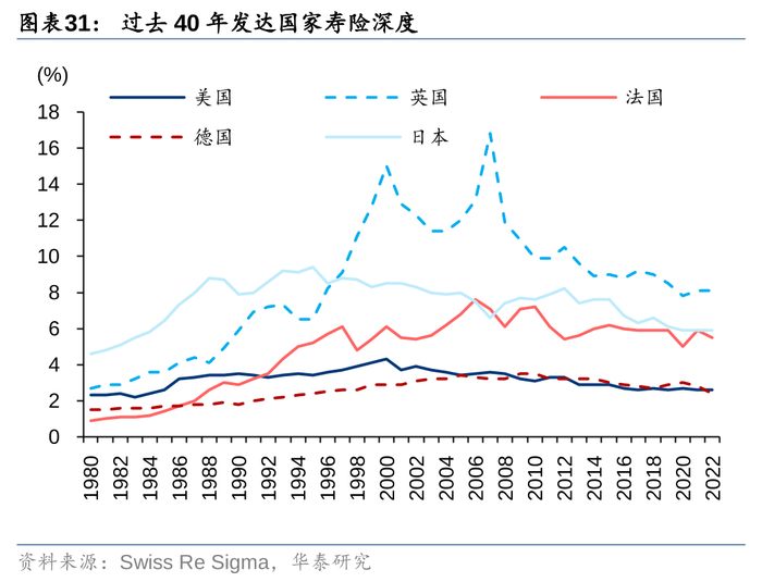 发达市场浮动收益寿险产品占比相对较高。美国人寿保险产品中浮动收益型产品(包括分红、变额)的比例在1980年就占比近半,并在后来的利率下行周期中逐渐上升到70%左右。其他发达经济体也多是如此。至于储蓄/保障产品的比例,我们注意到储蓄类产品经历过先升后降的发展阶段。美国在上世纪80、90年代,储蓄寿险产品的占比从不到70%上升到超过80%,但在2000年之后储蓄产品的占比不断下行。中国寿险业当下以传统型储蓄险为主,在利率下行的背景下,浮动收益型产品或大有可为。此外,当发展到一定的阶段后,储蓄型产品和保障型产品可能会存在此消彼长的关系。