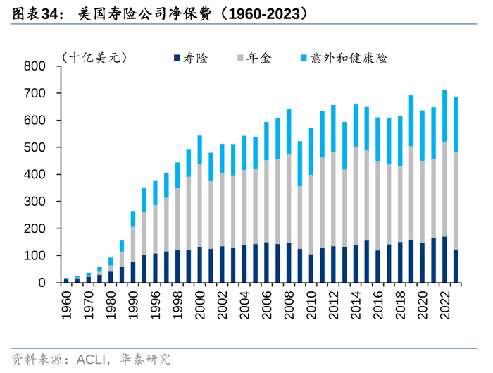 需要指出的是,美国健康险公司不在讨论范围内。美国人身险公司可分为寿险公司和健康险公司两类。寿险公司的业务主要包括人寿保险、年金、意外及健康险,例如纽约人寿、保德信集团、大都会人寿等。健康险公司作为管理式医疗机构,专注于经营健康险,提供“保险+服务”,医疗网络和服务更为完备全面,例如联合健康。美国寿险公司保费在1980-2000年利率下行期快速增长,年均复合增速达到9.2%,步入21世纪后增长放缓,保费波动上行。健康险公司保费自2006年以来快速增长,2006-2023年年均复合增速为7.9%。我们重点关注寿险公司,健康险公司暂不在讨论范围内。