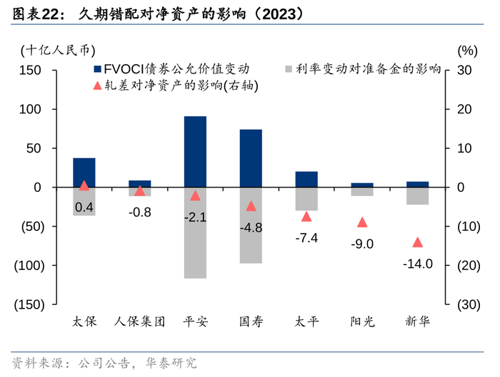 期限和利率变动结合起来,就变成了久期,用久期概念可以把利差损风险在一定程度上进行量化分析。久期是指资产负债对利率的敏感性,也就是利率变动对资产价值和负债价值的影响。通常而言,期限越长,久期也越长,对利率变动越敏感。这样期限错配就变成了久期错配,资产久期短于负债久期,就变成了资产对利率的敏感性小于负债对利率的敏感性。利率下行,就会导致资产的增值速度赶不上负债的膨胀速度,错配会挤压净资产,这相当于把久期错配量化了。保险行业新会计准则提供了相关的数据,使得我们能够对久期错配有直观感受。