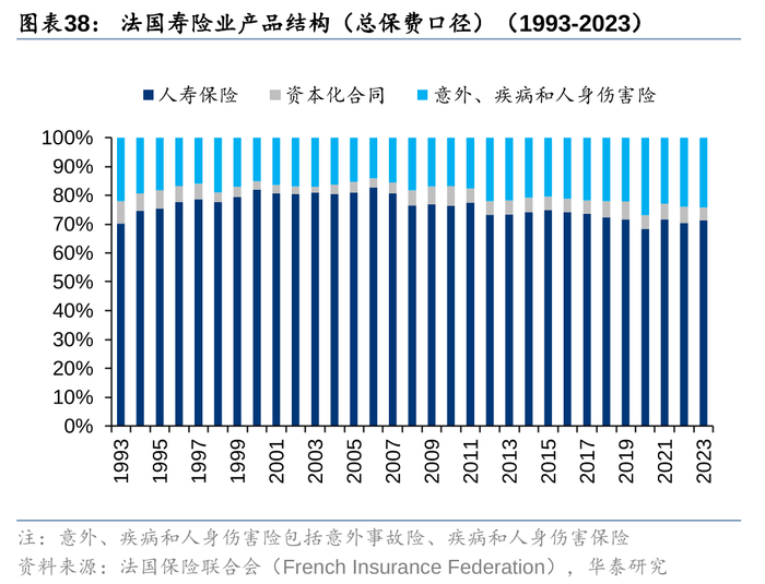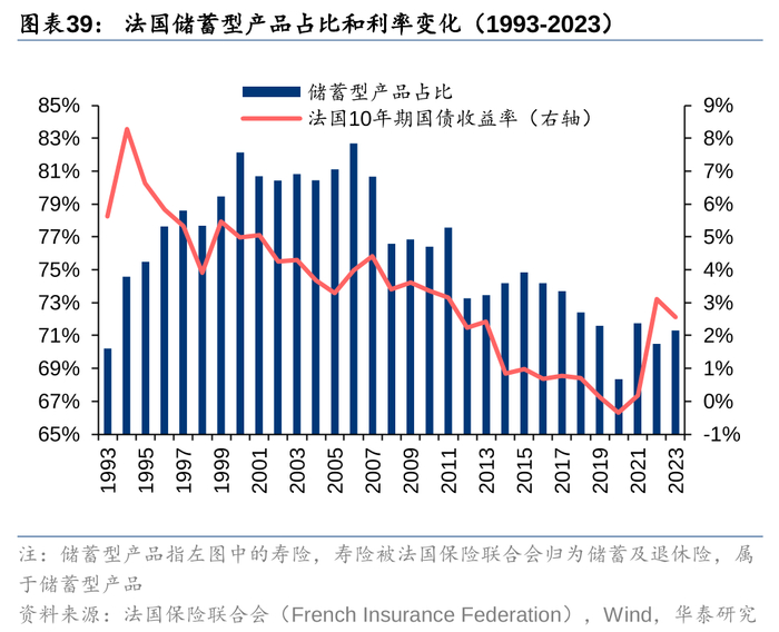 法国同样呈现储蓄型产品先上升后下降的特点,转折点在2007年前后。法国寿险产品分为:1)储蓄及退休险(储蓄类):包括人寿保险和资本化合同(一种用于中长期投资的储蓄产品);2)健康及保障险(保障类):包括意外事故险、疾病和人身伤害保险。2007年之前法国储蓄产品占比上升,根据法国保险联合会数据,储蓄型产品占比由1993年的70.2%上升至2006年的82.7%。到2006年时,法国10年期国债利率已经下降至4%左右水平,储蓄险竞争力相对减弱,叠加2009年后股市长期上行,其占比缓慢下降。直到2021年利率回升后,储蓄产品占比才有所回升。