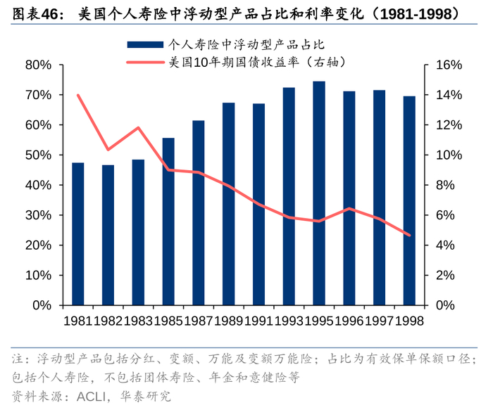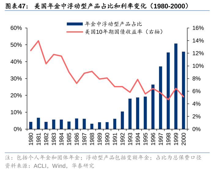 美国浮动型产品占比较高,并在20世纪八九十年代利率下行期快速提升。美国个人寿险(不含年金、健康险)中的浮动型产品包括分红、变额、万能及变额万能险,1980年左右占比在40%~50%的高位,二十世纪八九十年代利率快速下行期,浮动型产品占比呈现增加趋势,90年代末达到70%左右,不保证收益的产品成为主要类别。年金也类似,浮动型产品(变额年金)占比在上世纪九十年代快速攀升,由1990年的4%上升至1999年的51%,主要受利率下行至低位、股市繁荣发展以及政策等因素驱动。