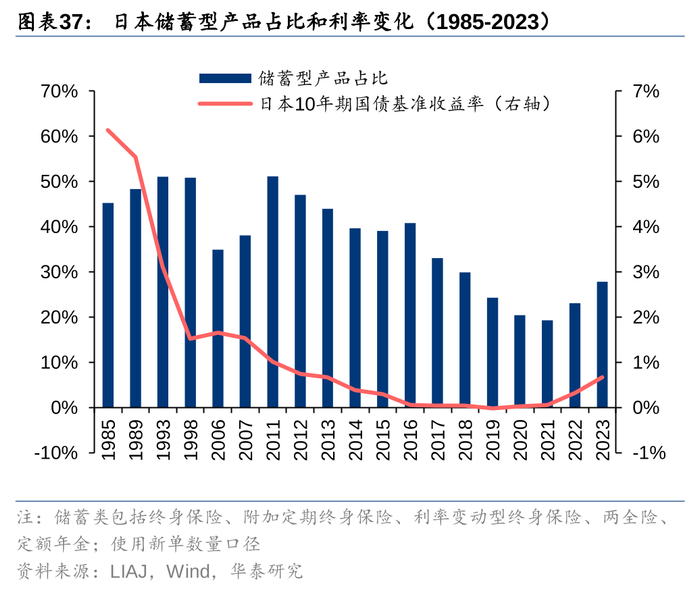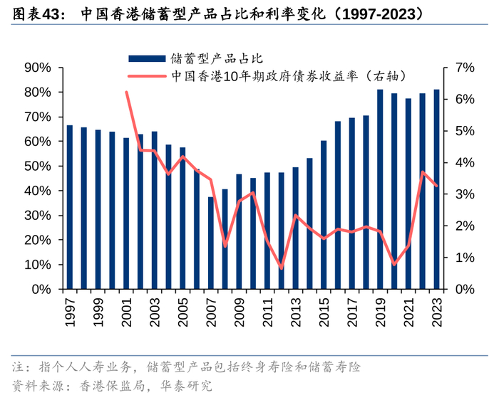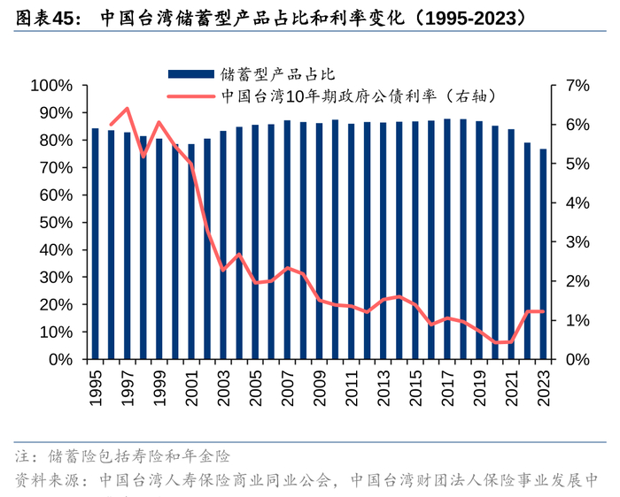 中国台湾寿险业分为寿险、健康险、意外险、年金险四类,其中寿险主要为储蓄类产品。以中国台湾最大的寿险公司国泰人寿为例,传统寿险中储蓄型产品占比达76%(2023年)。因此我们将寿险和年金粗略视为储蓄型产品。台湾寿险业以储蓄型保险为主,占比达80%左右。2001-2010年,中国台湾利率快速下行,10年间下降4.1pcts。在此期间,储蓄型产品的保费占比由79%的高位上升至87%的更高水平。之后占比维持在87~88%左右,直到2021年利率反弹,占比才逐步下降。
