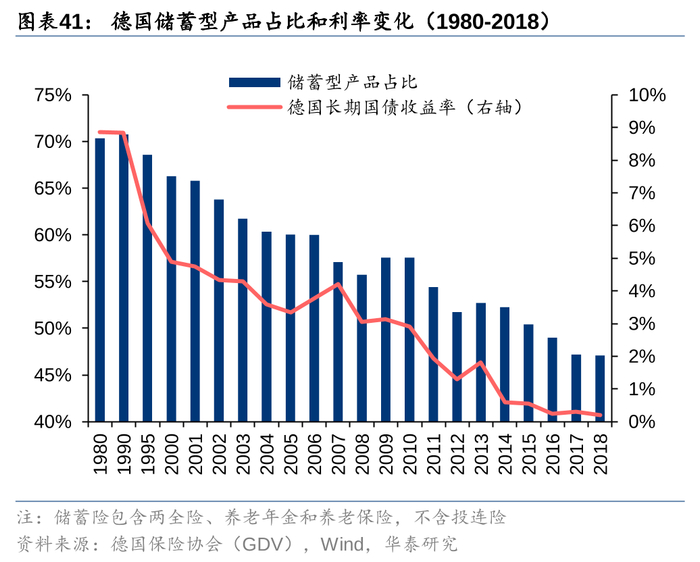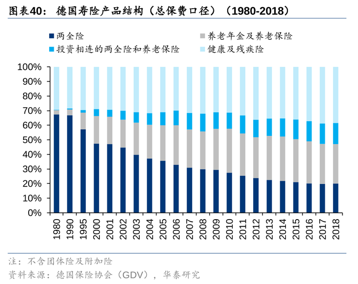 德国储蓄险包含两全险、养老年金和养老保险,但与美日法不同,储蓄险保费占比自1980年呈现下降趋势。我们认为,一方面,在老龄化的驱动下,健康险快速发展;另一方面,股市的繁荣发展带动投连险占比提升。但需要注意到,德国储蓄险占比本身已处于较高水平,上世纪八九十年代在70%左右,到2018年时也有接近一半的水平。
