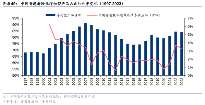 2000年以来中国香港浮动型产品占比维持在65%以上。中国香港浮动型产品包括分红险和投连险。在利率快速下行期(2000-2007年),中国香港寿险业浮动型产品占比快速上升,主要原因为投连险快速增长。中国香港股市在此期间高速发展,带动投资型保险热销,2007年时投连险保费占比达到51%。在2008年金融危机后,投连险占比快速萎缩,2023年时仅有8%,带动浮动型产品占比在2007-2015年有所下降。与此同时,分红险却实现了长期发展,随着利率下行,分红险保费占比在2020年时上升至71%。总的来看,2000年以来,中国香港寿险业浮动型产品占比维持在65%以上,最高曾达到90%以上的高位。