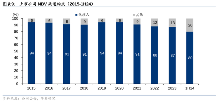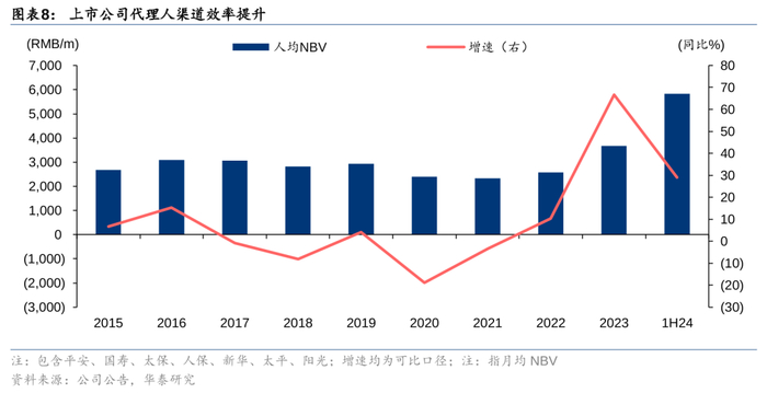 代理人改革有望推动产能持续增长。代理人渠道依然是上市寿险公司最重要的价值创造渠道,1H24NBV占比合计约为80%,代理人渠道的转型升级将有望持续推动代理人效率提升以及寿险公司的NBV增长。