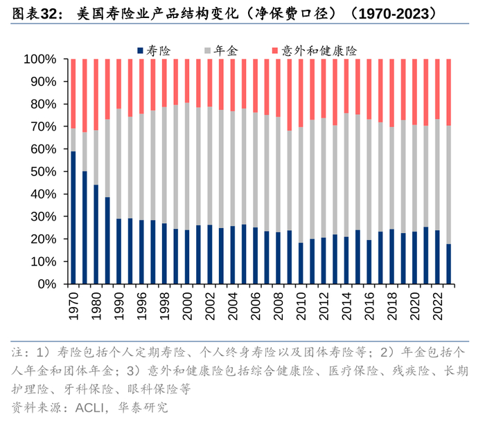 1980-2000年储蓄险占比整体增长,其后缓慢下降。美国寿险公司业务可分为寿险、年金、意外和健康险三部分,其中寿险业务包括个人寿险(终身、定期)以及团体寿险,年金包括个人年金和团体年金,意外和健康险包括综合健康险、医疗保险、残疾险、长期护理险、牙科保险、眼科保险等。寿险业务中终身寿险占比最高,因此我们将寿险和年金共同视为储蓄险。1980-2000年随着利率下行,美国储蓄产品占比呈现上升趋势,由68.3%上升12.3pcts至80.5%,其中年金占比实现大幅提升。步入21世纪后,利率仍不断下行,2000年时10年期国债收益率已到5%左右的位置,相较于1980年左右12%的水平,利率已大幅下降。储蓄险作为储蓄手段,收益率也下降到较低水平,其占比开始小幅下降。