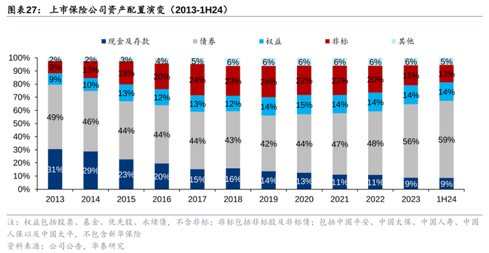 保险资金的债券投资(不含永续债优先股比例过去几年稳中有升,并在2023年加速上升,挤出了非标投资的比例,显示保险资金整体风险偏好在下降。其中,政府债券的配置比例在过去几年迅速上升,寿险公司尤其明显。我们估计,6家主要上市保险公司2023年和1H24分别增配了1.29/0.67万亿的政府债,占当年保险资金新增规模的85%/50%。