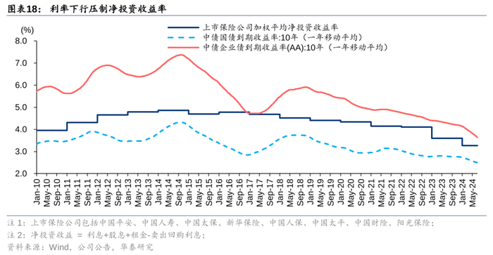 在过去的10多年中,上市公司的NIY基本处于无风险利率和AA信用债收益率之间。2013-2017年,上市保险公司平均NIY达到5.0%左右,属于相当高的水平。这一阶段10年期无风险利率最高触及4.5+%,为高投资收益率创造了良好的利率环境。2018年后,伴随着市场利率的不断走低,保险NIY也节节下行。2023年以来的利率快速下行对险资带来较大压力,平均NIY从2022年的4.1%下降至1H24的3.3%。需要指出的是上半年的NIY通常会被低估,因为大部分股息收入是下半年发生的。但利率下行的压力是显而易见的。