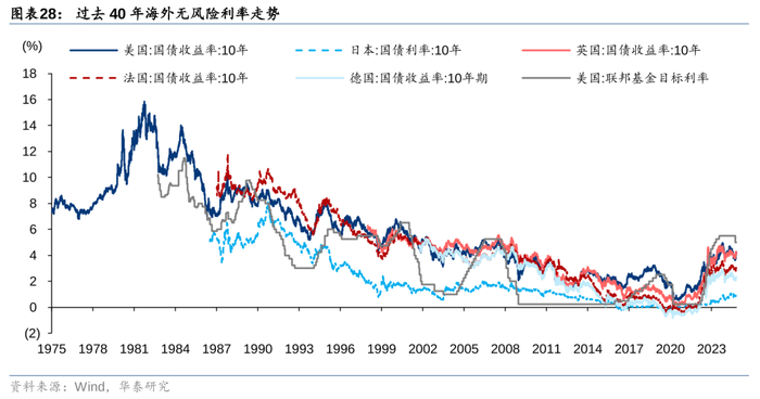 在过去40年海外利率下行的过程中,中国加入WTO的作用不容忽视。2001年入世促进了我国出口导向型经济的发展,加速了全球化进程。大量高性价比的中国商品进入全球市场,为其他国家提供了低通胀环境,进一步推动海外央行低利率政策的实施。此外,中国长期保持贸易顺差,积累了大量外汇储备,并大量购买西方国家的债务,尤其是美国国债,为全球金融体系带来了额外的流动性供应,也推动了海外主要国家的长期利率下行。