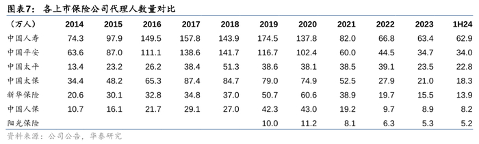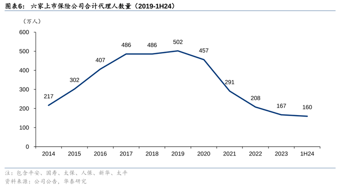代理人产能大幅提升,队伍人数止跌企稳。2023年和1H24,上市公司代理人产能连续实现大幅提升,有力推动了行业NBV的强劲增长。我们估计,可比口径下,2023年和1H24上市公司代理人合计人均NBV分别同比增长67%/29%,其中1H24人保、太平、新华实现超越翻番的增长。已经有越来越多的保险公司把管理重心转移到代理人效率和产能上,以及核心代理人的规模上,对代理人总数量的重视程度在降低。当前代理人数量已经出现止跌企稳迹象,中国人寿代理人数量今年开始回升,Q1/Q2/Q3末分别为62.2/62.9/64.1万人,中国平安代理人数量也从Q2开始回升。我们认为,未来会有更多公司实现代理人数量企稳回升,并逐步保持在合意水平。