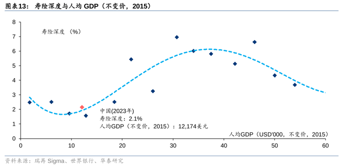 从全世界主要经济体的经验来看,寿险业的发展空间取决于经济的发展阶段。我们对全世界34个国家1999-2023年的数据分析显示,当人均GDP(美元,不变价,2015)超过1万美元的时候,寿险保险深度进入快速提升阶段。人均GDP从1万美元上升到3万美元,寿险的保险深度会从2%左右上升至6%左右。也就是说这一阶段寿险保费增长速度超过了GDP增长速度,寿险呈现出加速发展态势。我们认为这条曲线仍然有其现实意义,当居民富裕之后,增加寿险保障以保护人力资本是历史的大趋势,中国的消费者也不例外。中国的人均GDP刚刚超过1万美元不久,我们认为只要中国的经济继续发展,消费者就会购买越来越多的保险保障。