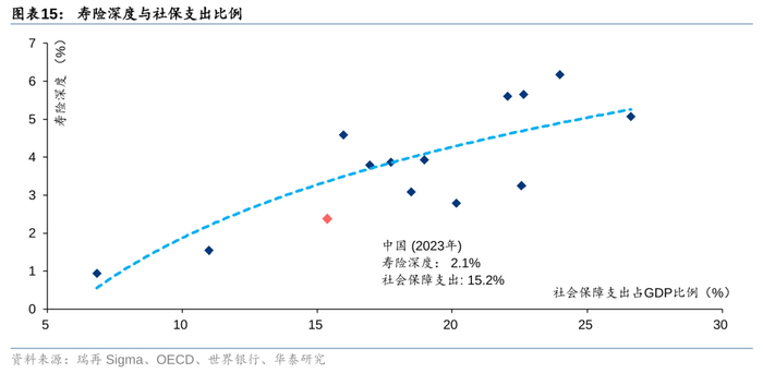中国2023年的社会保障支出占GDP比重为15.2%,寿险深度为2.1%。我们认为随着中国经济发展,社会保障支出和商业保险支出都将持续增加。中国目前的位置,处于社保相对较强而商业保险相对较弱的状态(位于拟合线的下方)。在保障这件事上,公共部门的投入力度大,私人部门投入的力度相对不足,预示着中国商业寿险需要加快发展,以提升全方位的保障水平。