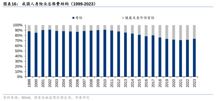 寿险产品大体可以分成保障和储蓄两类。保障产品覆盖小概率发生的风险事件,对消费者有“以小博大”的效应,保险金额相对于保费的杠杆比例较高;储蓄产品更多是提供长期稳健的投资回报,对风险事件的覆盖程度相对较低。任何一个寿险产品无非是保障和储蓄的组合,有的保障成分高一些,有的储蓄成分高一些。通常重疾险、意外险、医疗险、定期寿险被视作保障类产品,年金、两全、终身寿险等被视作储蓄类产品。目前我国寿险业以储蓄型产品(寿险)为主,2023年在总保费中的占比超70%。在上一轮重疾险带动的销售增长推动下,保障类产品的占比从2013年的10%出头上升至2020年的20%以上,但之后保障性产品的占比不再扩张,甚至在2023年有所降低。