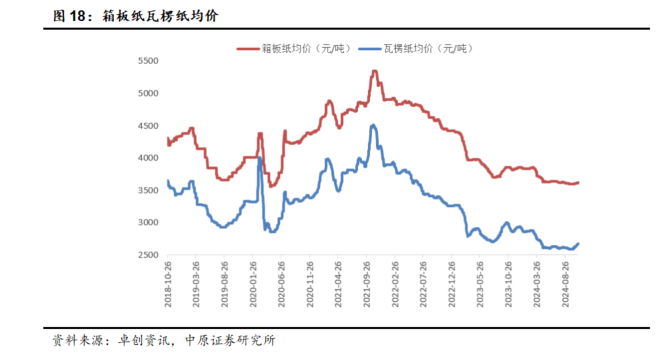 从价格来看,箱板纸本月末价格较上月末稳中有升、瓦楞纸价格偏强运行,本月持续上涨,根据卓创资讯,主要由于龙头纸企多轮上调出厂价,中小纸企跟随调涨,下游包装厂适量增加采购量,需求端的订单量有所增加,供需关系得到缓解。2024年10月31日,箱板纸均价为3614元/吨,较上月末价格上涨0.55%,瓦楞纸均价为2663元/吨,较上月末价格上涨2.92%。