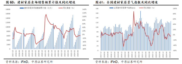 家居:地产优化政策效果显现,地产销售数据边际改善,但传导至开发投资、开工、竣工等方面仍需时间;9月建材家居市场迎来传统旺季,叠加家装“以旧换新”政策的实施,销售平稳回升;家具类零售额当月增速由负转正,显示市场在经历了两个月负增长后,销售情况有所回暖;家具出口增速继续收敛,出口仍保持增长但增速下滑;国家加码发布地产政策修复市场信心,部分城市商品房网签成交量出现不同程度好转,地产有望止跌企稳;国家加力支持消费品以旧换新政策带动下,家居消费也有望增长;家居板块前期受制于地产与消费的双重影响,估值一直处在历史低位,当前估值已开始修复,后续仍具修复空间。