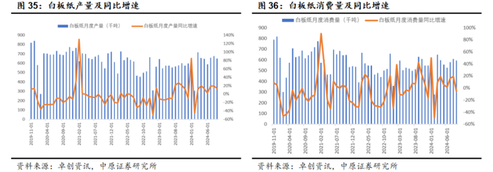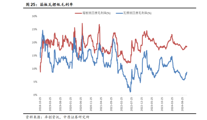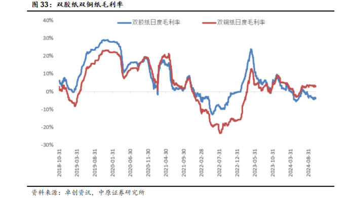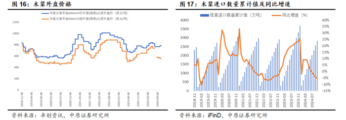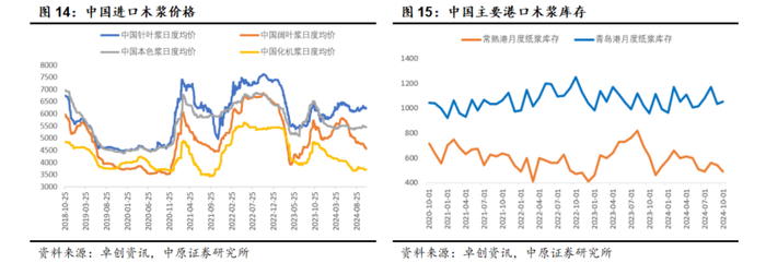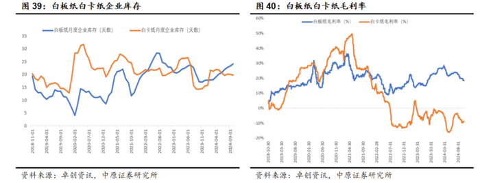 从库存来看,库存同比均有增加,白卡纸库存环比继续下降。根据卓创资讯,白板纸库存环比上升,主要由于本月市场需求无明显放量,下游采购积极性欠佳,纸厂库存仍呈增加趋势,而白卡纸库存环比略有下降,主要由于市场整体产销承压,纸厂或停机降产,或执行价格优惠政策以加快库存消化。2024年10月,白板纸、白卡纸月度企业库存天数分别为24.17、19.72天,同比分别+6.94天、+5.45天,环比分别+0.78天、-0.33天。