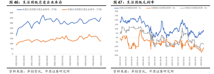 从盈利能力来看,木浆、甘蔗浆生活用纸毛利率延续上升,竹浆生活用纸毛利率略有下滑,10月上游木浆价格震荡下跌,引起木浆生活用纸成本下跌,而纸价波动有限,因此竹浆生活用纸毛利率有所上升。2024年10月31日,木浆、甘蔗浆、竹浆生活用纸日度毛利率分别为7.85%、-12.77%、-7.3%,较上月末分别+1.56pct、+1.80pct、-0.83pct。